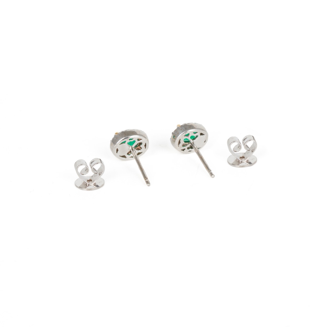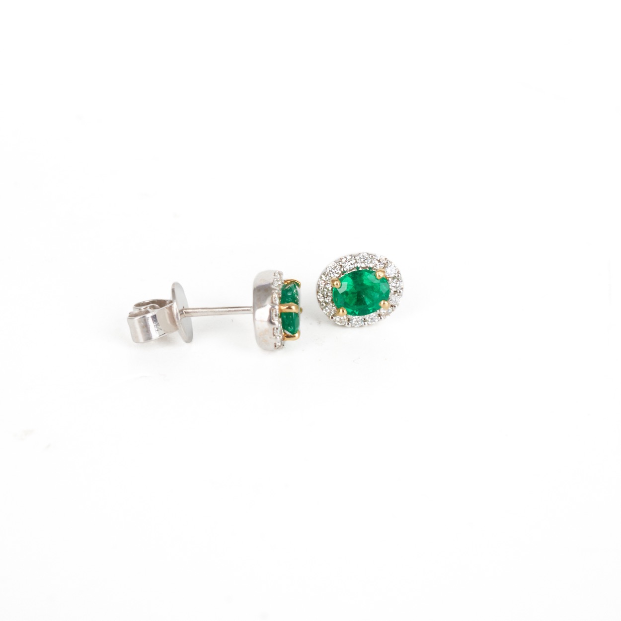 18ct White gold claw set oval emerald and diamond halo cluster earrings, yellow gold central claws