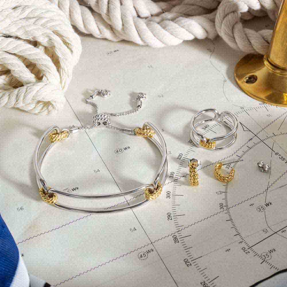 Designed to evoke nautical imagery, alternating its intricate rope patterns with solid link-like strands of silver, it beautifully contrasts its golden tones against the cool sterling silver design.
