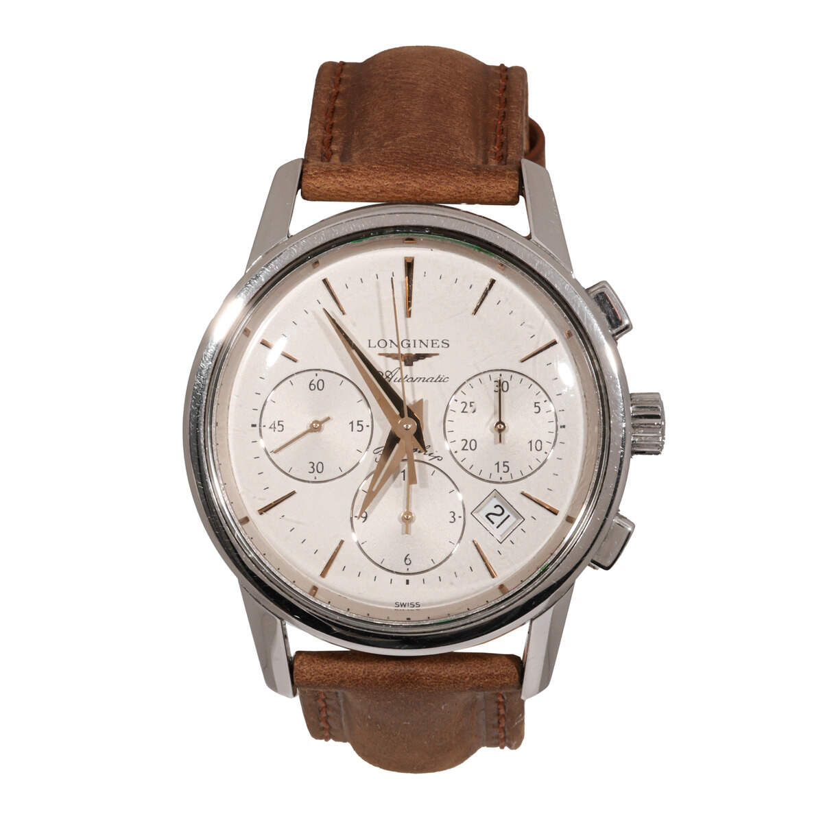 Pre Owned Longines Flagship Heritage Chronograph, Silver dial on Tan Leather Strap