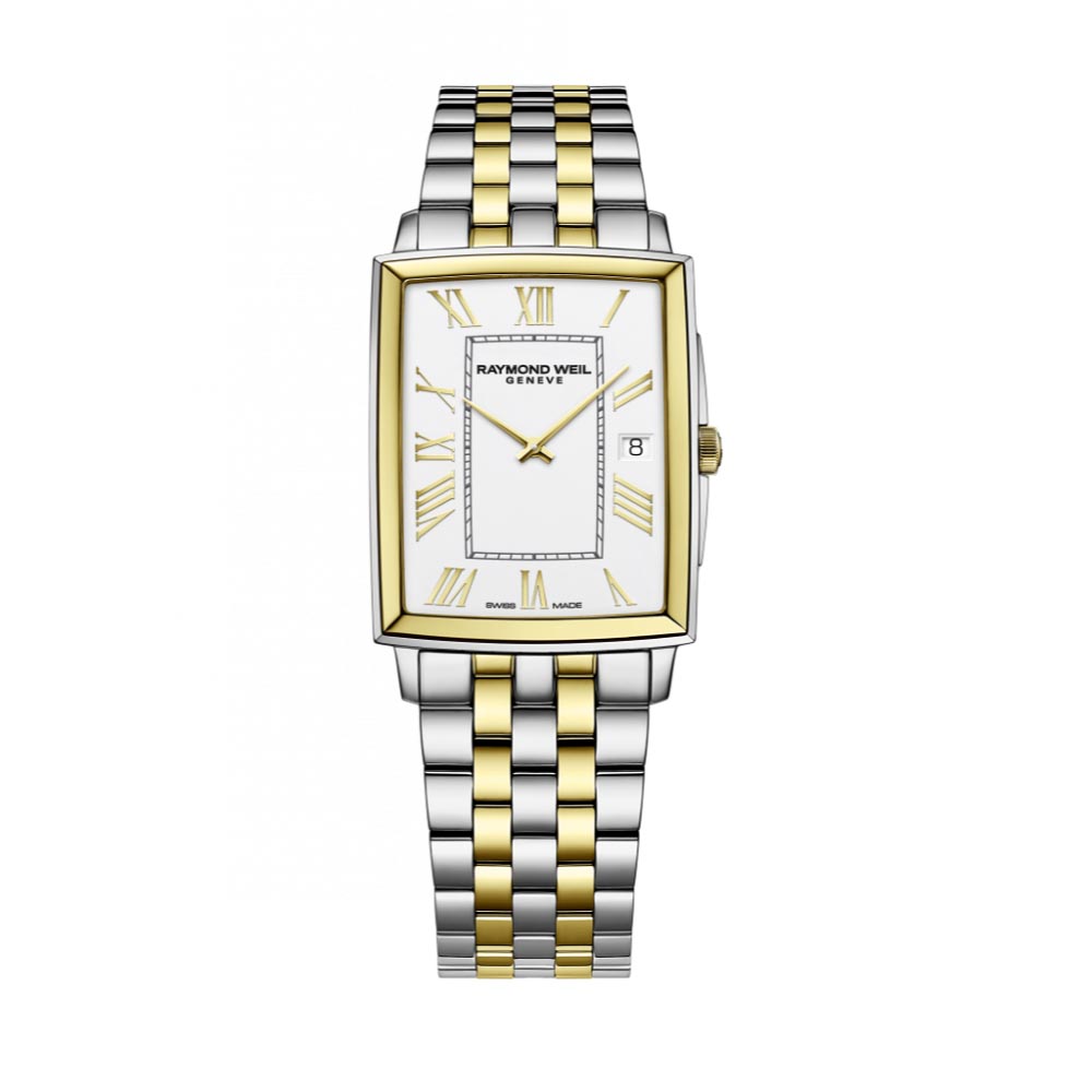 Equipped with a quartz movement, this toccata men’s classic two-tone white dial watch features a rectangular sleek stainless steel case with yellow gold PVD plating, a 3-o’clock date window and a sophisticated white dial punctuated with Roman numeral markers to add a touch of warmth to this modern classic.