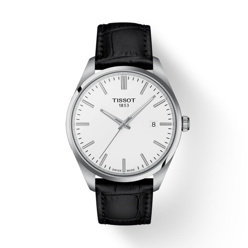 This Tissot PR 100 Quartz model features a 40mm stainless steel case, a bright white dial and a classic black leather strap for a touch of elegance that will make the difference.
